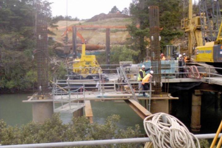 Grouting Services was engaged for the design, supply and installation of a tube-a-manchette system to facilitate base grouting of a pile using the technique of high pressure post-grouting. Drilling conditions encountered within the East Coast Bays Formation bedrock while piling for Pier 5 necessitated a review of the founding conditions for the downstream pile to Pier 5. It was determined that the rock encountered at founding level was unsuitable to provide the necessary bearing capacity for the pile to support the new bridge. A grouting programme was developed by Grouting Services and the tube-a-manchettes designed and constructed in-house for installation by Fulton Hogan as part of the pile construction methodology. Pressure and volume limitations were considered and a monitoring beam and equipment used to record any uplift.